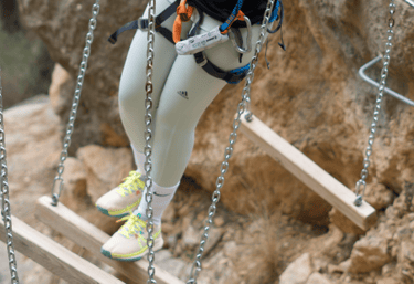 Este tramo empieza con una trepada de grapas que conecta con un puente colgante de 25 metros de longitud y que cruza el barranco de lado a lado.