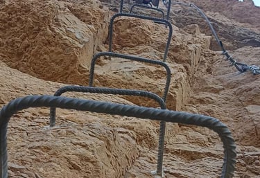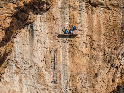 La ascensión continúa a través de más grapas hasta llegar a la "escalera invertida" de 6 metros de longitud que nos obliga a subir mirando al vacío.